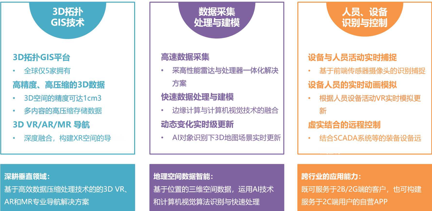 隨著全球數(shù)字化水平不斷提高、人工智能和物聯(lián)網(wǎng)等技術(shù)飛速發(fā)展,“數(shù)字孿生”也更多被認(rèn)知和引用。數(shù)字孿生(Digital Twin)是一種物理空間與虛擬空間的虛實(shí)交融、智能操控的映射關(guān)系,通過(guò)在實(shí)體世界以及數(shù)字虛擬空間中記錄、仿真、預(yù)測(cè)對(duì)象全生命周期的運(yùn)行軌跡,實(shí)現(xiàn)系統(tǒng)內(nèi)信息資源、物質(zhì)資源的最優(yōu)化配置。通過(guò)研發(fā)和集成不同維度的空間測(cè)繪技術(shù)和數(shù)字化軟件產(chǎn)品,形成了貫穿數(shù)據(jù)采集、處理和應(yīng)用的全產(chǎn)業(yè)鏈支持能力,為智慧城市、工業(yè)4.0和智能駕駛行業(yè)客戶提供全產(chǎn)業(yè)鏈的數(shù)字孿生(Digital Twin)解決方案。以人工智能技術(shù)為手段,結(jié)合了空間地理信息技術(shù),自主研發(fā)出了全產(chǎn)業(yè)鏈的數(shù)字孿生一站式服務(wù),并通過(guò)綜合運(yùn)用大數(shù)據(jù)和物聯(lián)網(wǎng)技術(shù)為數(shù)據(jù)賦能,驅(qū)動(dòng)“智能+”在各個(gè)細(xì)分領(lǐng)域的滲透。